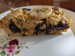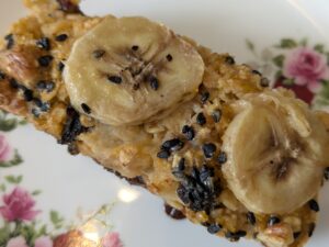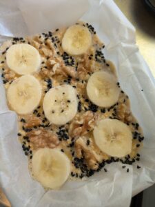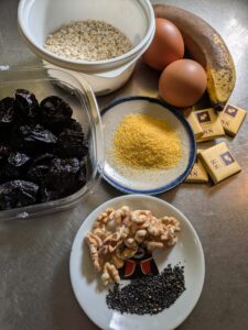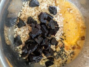 材料はバナナ、コーングリッツ、オートミール、玉子、ドライプルーン、胡桃、黒ゴマ、高カカオチョコ、牛乳(必要があれば)