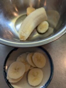 バナナは飾り用(3ミリの薄切り)を取っといてから、残りはボールに入れ、潰します。