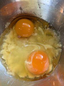 バナナに玉子を入れます。