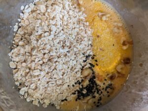 オートミール(45g)、コーングリッツ(10g)、一部のぐるみと黒ゴマを入れます。