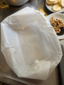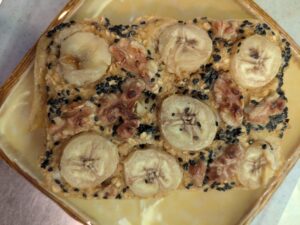 残りの生地も全部入れ、上に飾り用のバナナ、胡桃、黒ゴマを乗せ、オーブンで160℃、25分焼きます。