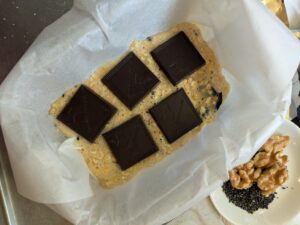 生地の半分を容器に流し入れ、上にチョコを並びます。